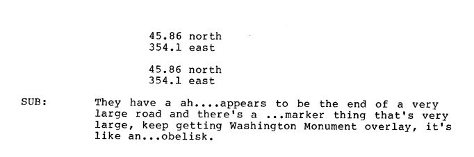 «Похоже на конец очень широкой дороги, и там стоит маркер, очень большой, на ум приходит Монумент Вашингтона, похоже на обелиск», — приводятся в документе слова экстрасенса.