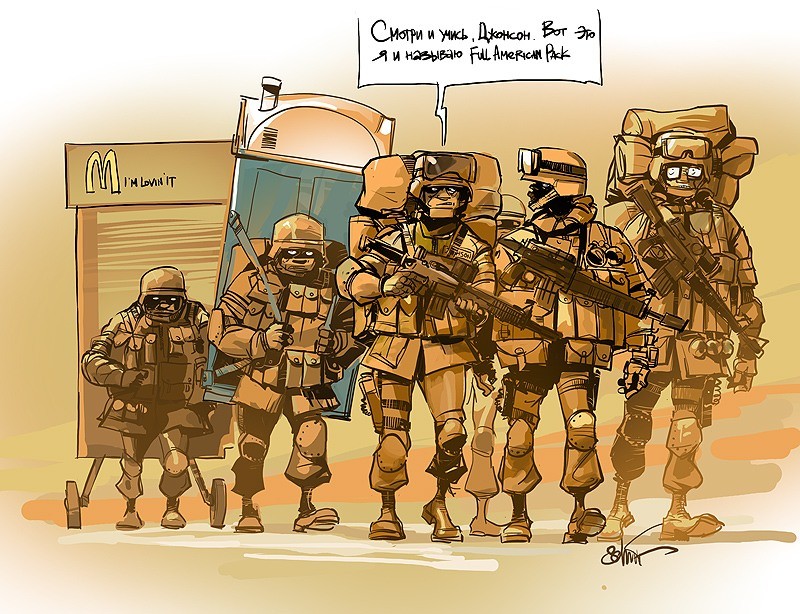 Кроме того в комплект полной выкладки входит уйма всего. Там боекомплект, то есть патроны, гранаты, выстрелы к подствольнику, автомат естес-сно (4кг, сцуко), нож здоровенный, сержантам ещё пистоль полагается с двумя обоймами, рядовые тоже могут иметь, но по желанию. Ещё рация + запасные батарейки, прибор ночного видения, ночной прицел (это всё с батарейками + запасные), натовские сухпайки, фляга и проч. и проч., вплоть до фонарика, даже днём. Много у них всего. Вес иногда превышает 40 кг, богато живут.