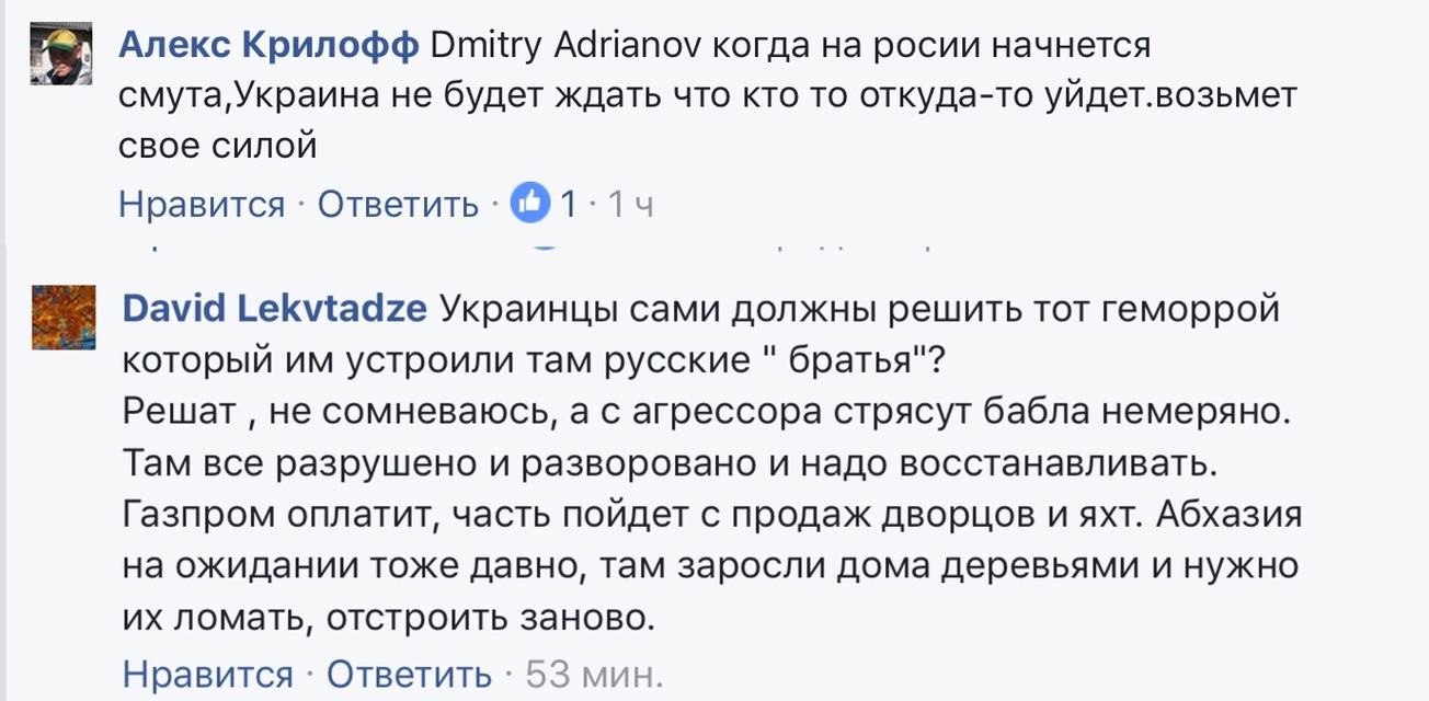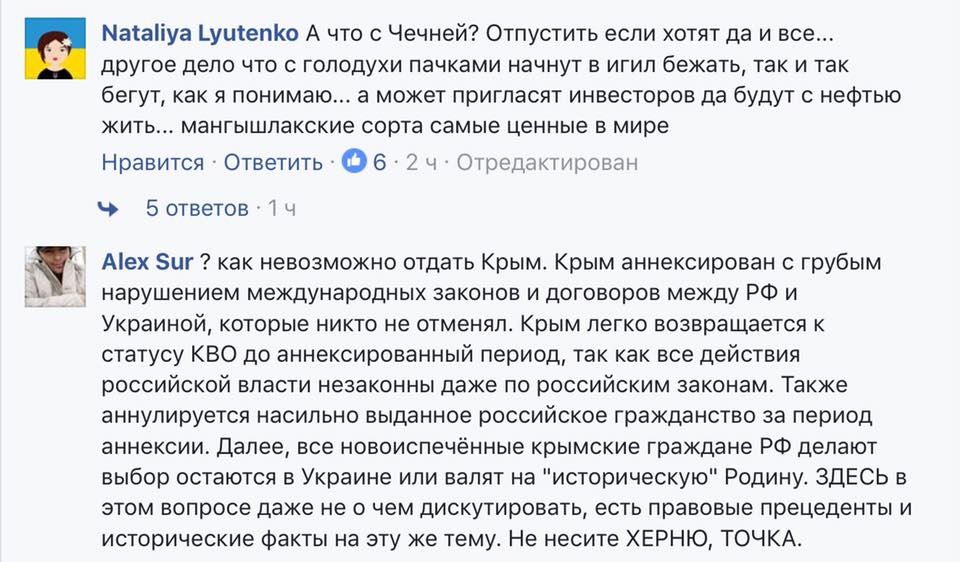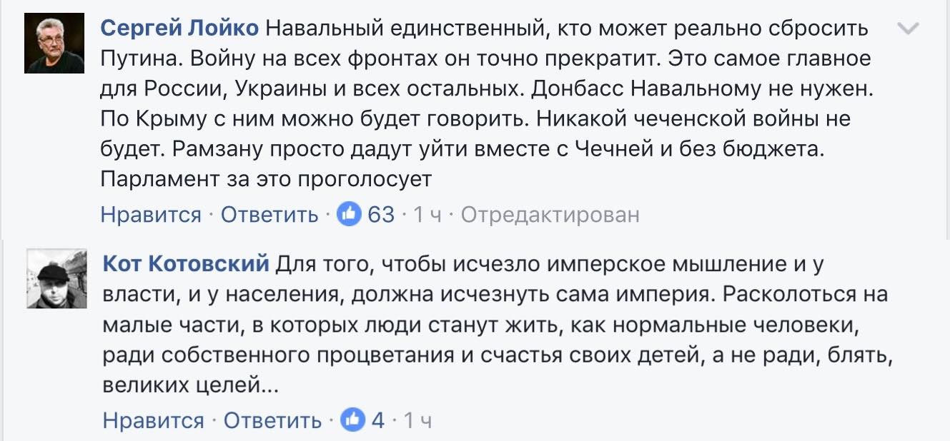 Некто Бабченко затеял дискуссию на тему «Если Навальный станет президентом» с акцентом на вопрос, отдаст ли он Крым и Донбасс. Сам пост, за исключением фразы «Навальный — это новый Ельцин на танке. Россия таких любит», — размазанный и скучный. Но в комментах просто трэш!