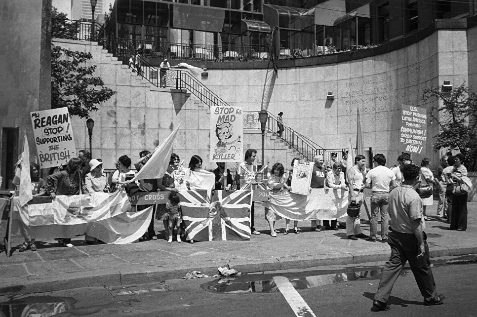 Участники демонстрации протеста против агрессивных действий Великобритании и поддержки Лондона Вашингтоном во время англо-аргентинского конфликта. США, Нью-Йорк, 1982 год