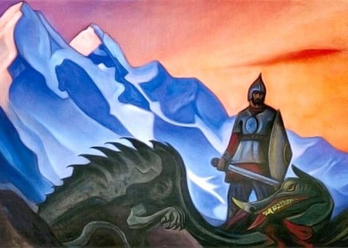 Но вот поднимается из пожаров и пепелищ, из народных стенаний бесстрашный витязь. Колет змея копьём, топчет конским копытом. Рассекает на куски его железное тулово и истекающие чёрной кровью ломти сбрасывает назад в преисподнюю, толкая их туда остриём серебряного копья.
