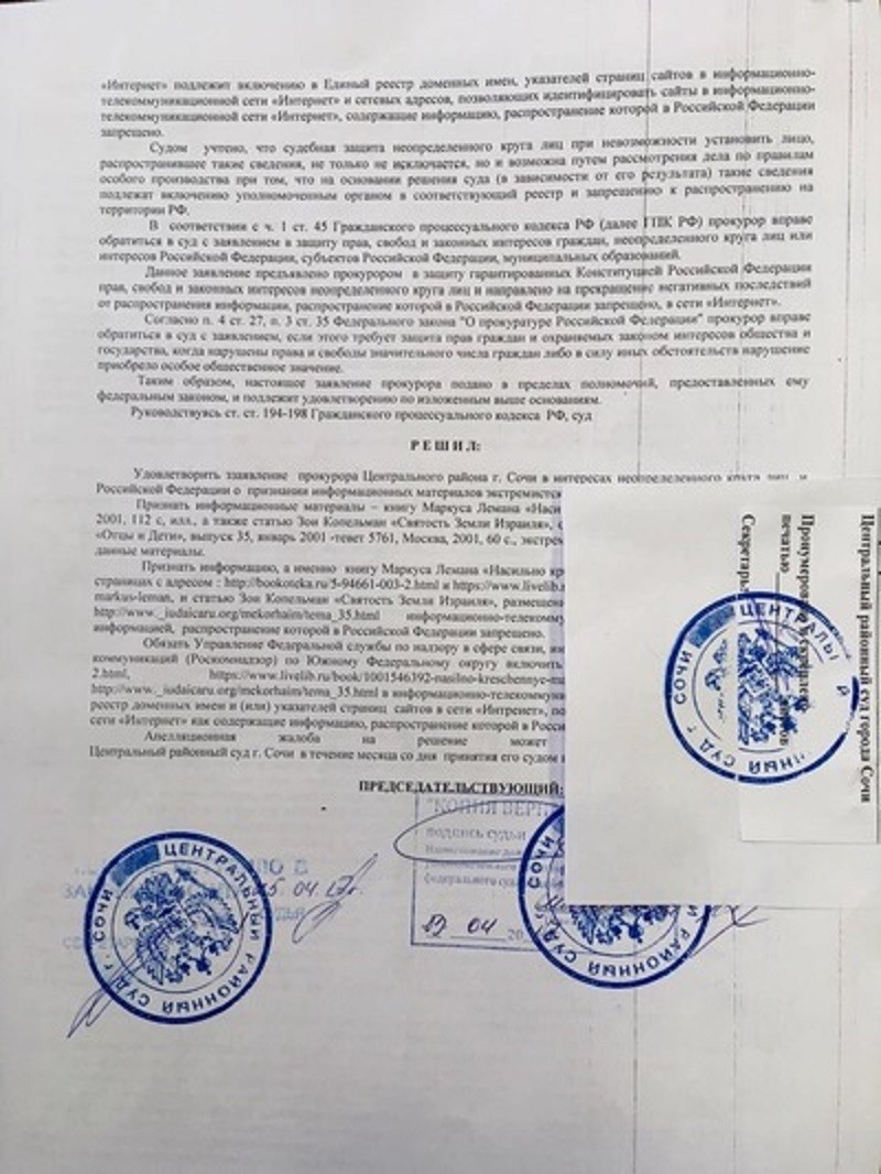 Именно с использованием этого экстремистского материала Херсонский проводил обучение детей в «своей» общине. Именно его он, видимо, полагал использовать в обучении перспективной еврейской молодежи в рамках «всероссийской образовательной структуры».