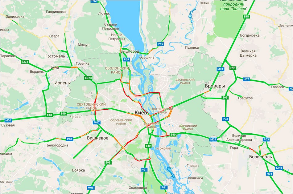 Google не хуже «Яндекса» показывает пробки в Киеве. Скриншот ситуации на 10.00.