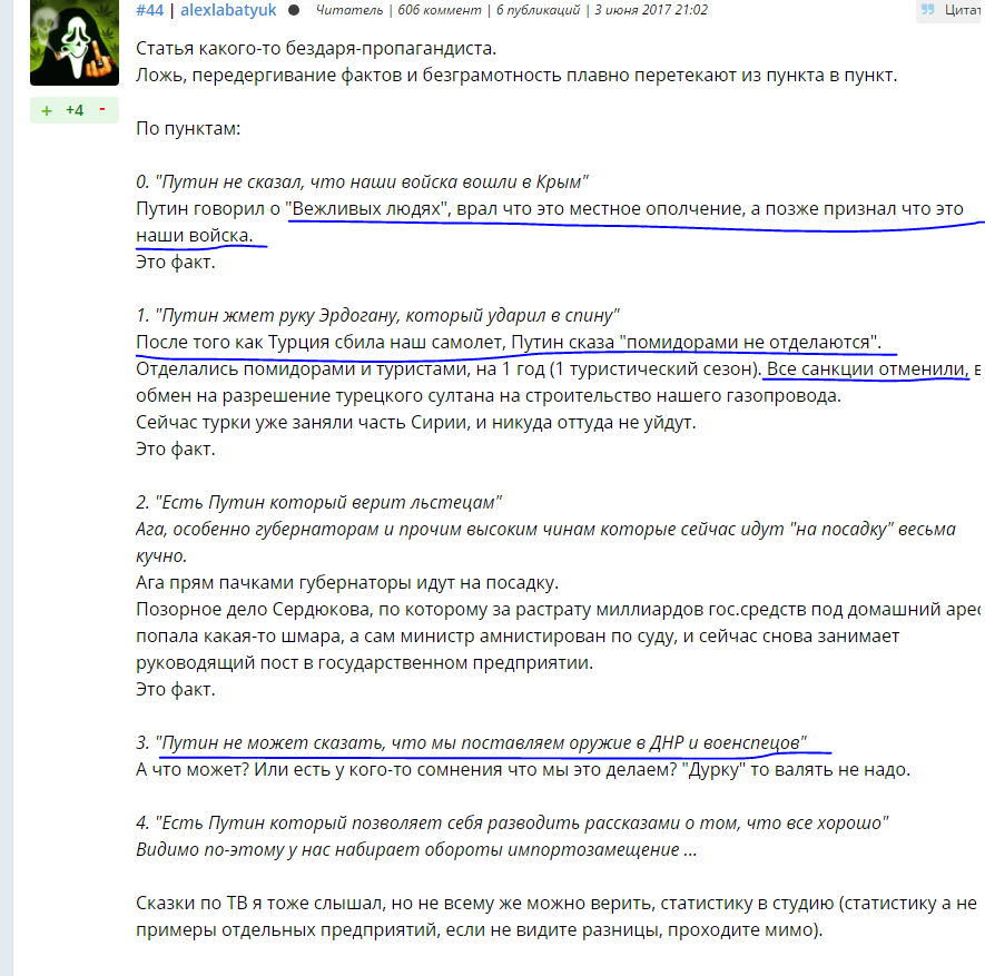 Почему Толик так решил? Неизвестно. Просто решил так и сказал. Обратите внимание: это прямым текстом заявляет видеоблогер, который гордится тем, что не говорит попусту, и сам других притягивает за лживые слова. Но как только речь заходит о России и Путине, в дело вступают какие-то иные принципы и этот же видеоблогер с умным и важным видом несет всё, что угодно, даже не беспокоясь за доказательство и обоснование своей позиции.