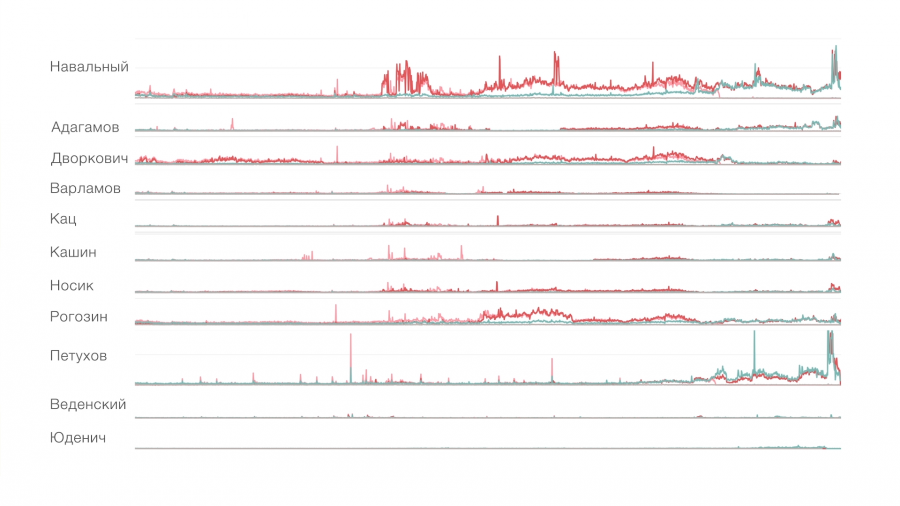 По странному совпадению эти "шипы", которые показывают на массовую регистрацию фолловеров, которые ведут себя как боты или являются ботами, подозрительно совпадают с важными для Навального политическими датами. Например, такие пики любви ботов к аккаунту Навального пришлись на дату его апелляции по делу Кировлеса (25 июня 2013), однако самый яркий период был с ноября 2013 по март 2014 года. В это время количество подозрительных подписчиков увеличилось не только у Навального, но и Каца, Варламова, но ни у кого не было такой вакханалии ботоводства. Руководитель ФБК в этом смысле — однозначный чемпион и неоспоримый лидер российской блогосферы, который обгоняет и оппозиционеров, и охранителей. Ну, а совсем недавно был зафиксирован вообще вопиющий случай, когда в преддверии акций 26 марта, у Навального и известного блогера Валентина Петухова, который помогал ему агитировать молодежь на эту акцию, вдруг одновременно выросло количество подписчиков, что прозрачно намекает на то, что одна и та же ферма обслуживает самого Навального и тех, с кем он дружит.