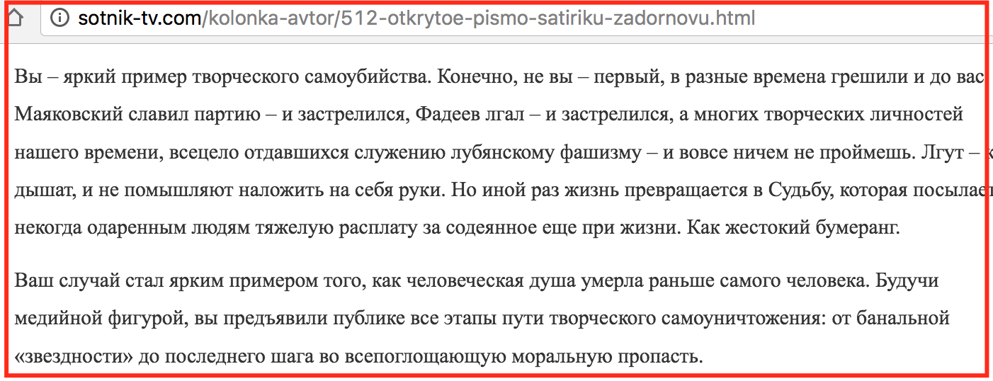 По сути высера недомерка: Не таким как Саша Сотник писать подобные прижизненные панегирики. Ведь он не то что ногтя Михаила Задорного не стоит – это люди из абсолютно разных категорий. Задорнов творил, творит и, дай Бог, продолжит творить пока будут силы. А удел Сотников попрошайничать, гадить и спиваться в трусливом осознании своей бездарности.