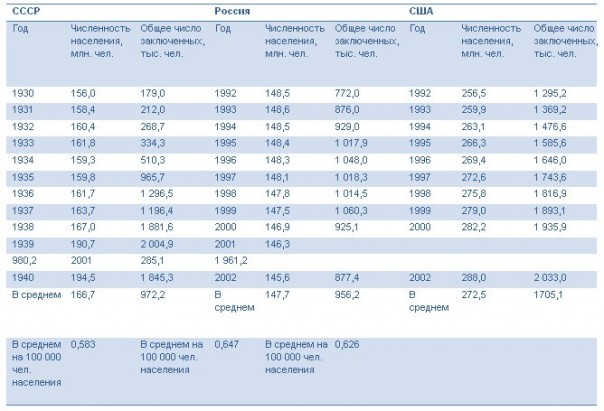 Согласно этой таблице получается, что в среднем, в Сталинском СССР было 583 заключенных (И уголовка и репрессии) на 100 000 свободных людей.