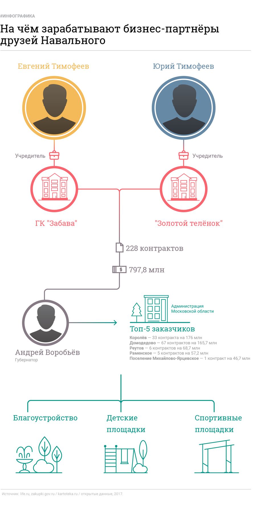 Бизнес-партнёры известного оппозиционера Алексея Навального продолжают кормиться из бюджетного котла. Как выяснил Лайф, десятки муниципалитетов и государственные структуры Московской области очень полюбили компании "Забава" и "Золотой телёнок", которые принадлежат отцу и сыну Евгению и Юрию Тимофеевым. Их фирмы выигрывают госконтракты на поставку оборудования и обустройство детских, спортивных и развлекательных площадок, заработав на этом за последние несколько лет около 800 млн рублей. У семьи Тимофеевых есть ещё один бизнес по продаже ламп — он непосредственно связан с Фондом борьбы с коррупцией (ФБК) Алексея Навального и его проектом "Роспил".