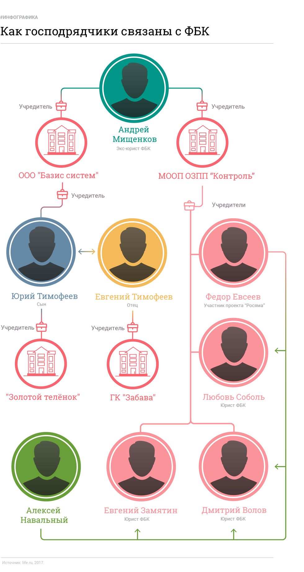 Мищенков в своё время стал учредителем Общества защиты прав потребителей "Контроль". Другие учредители — ближайшие соратники Навального. Это Любовь Соболь, которая помогала политику с его проектом "Роспил", юристы ФБК Евгений Замятин и Дмитрий Волов. Также долей в фирме владеет Фёдор Езеев, который в своё время был участником проекта Навального "Росяма".