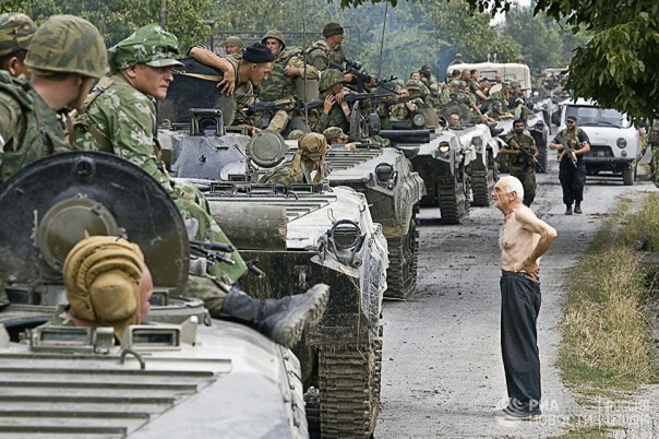 Колонна российских войск, движущихся в место временного лагеря на территории Грузии. Справа - житель Грузии