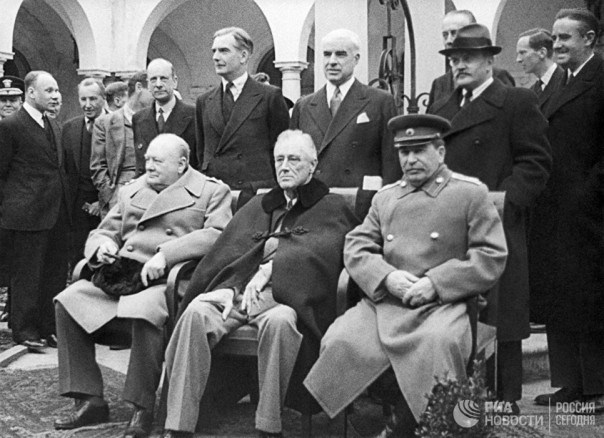 И. Сталин, Ф. Рузвельт и У. Черчилль на Крымской конференции в Ялте