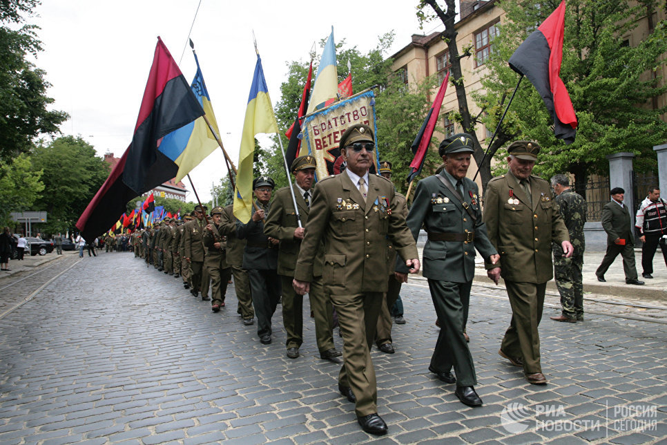Ветераны Украинской повстанческой армии (УПА) во время шествия к памятнику Степану Бандере в честь "Дня Героев" в центре Львова