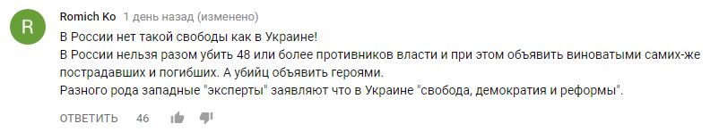 Дальше он рассказывает о том, что у украинцев есть национальный дух, что они если что - на Майдан. А русские бесхребетные рабы, которые покупают себе квартирки, машинки, живут сыто, и ничего изменить не могут. Конечно, это видео наполнено сарказмом, и человек, который видит ситуацию с обеих сторон решил пошутить, конкретно так. В окмментариях, естественно, нашлись как те, кто не понимает таких шуток, так и те, кто от души посмеялся. Особенно комментаторы отмечают актерскую игру автора видео. Многие продолжают шутить на заданную тему: