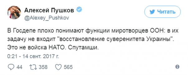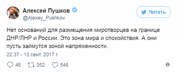 «Нет оснований для размещения миротворцев на границе ДНР, ЛНР и России. Это зона мира и спокойствия. А они пусть займутся зоной напряжённости», — написал Пушков в своём Twitter.