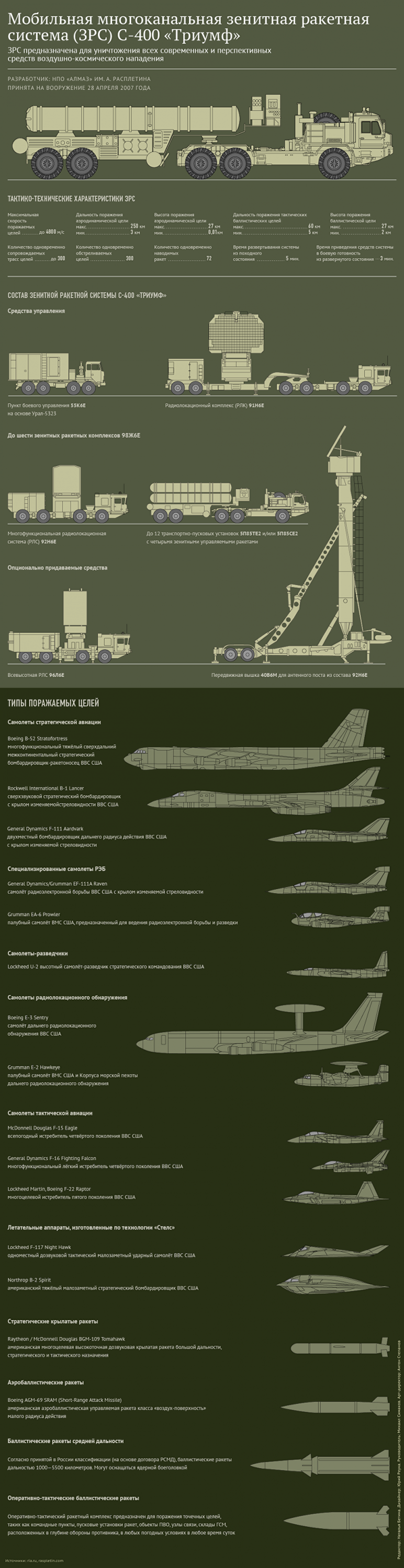 Спасения в воздухе от него нет — самолеты и крылатые ракеты уверенно ликвидируются на дальности до 250 километров, баллистические ракеты — до 60 километров. Из походного положения в боевое система разворачивается за три минуты. "Триумф" умеет одновременно вести до 300 целей и наводить по ним до 72 ракет. Несмотря на то что военные специалисты часто сравнивают систему С-400 с американским комплексом Patriot, он безнадежно проигрывает ей по множеству показателей.