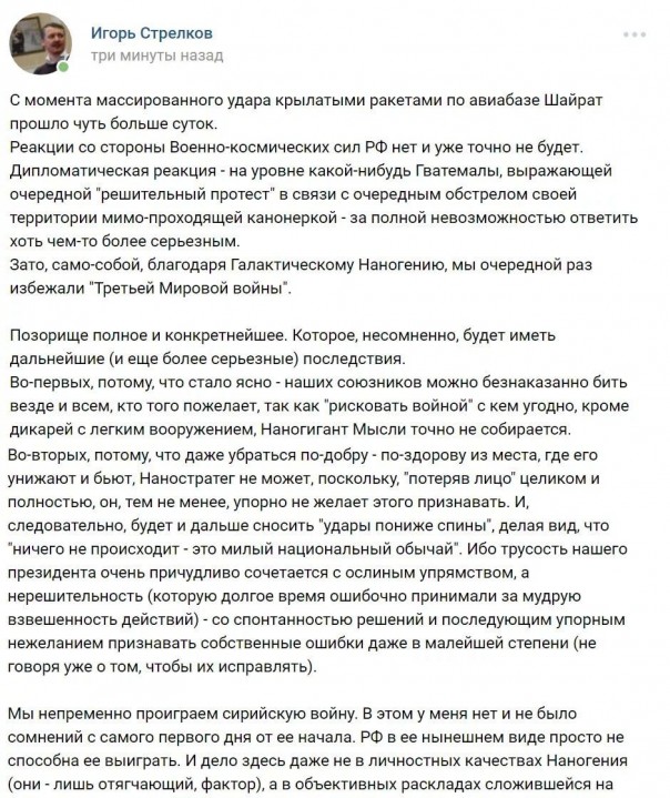 В своем посте в «Контакте» Стрелков изобразил российских добровольцев в качестве «пушечного мяса», которым прикрывают подходы сирийцам и выручают из переделок военную полицию. При этом беглый командир не преминул сопоставить свою фигуру с высшим военным командованием, выставив себя в качестве народного радетеля. Мол, «шифровок со сводками не получаю», но информацию о погибших рассекречиваю, саркастически подытоживает свой паникерский спич Гиркин.