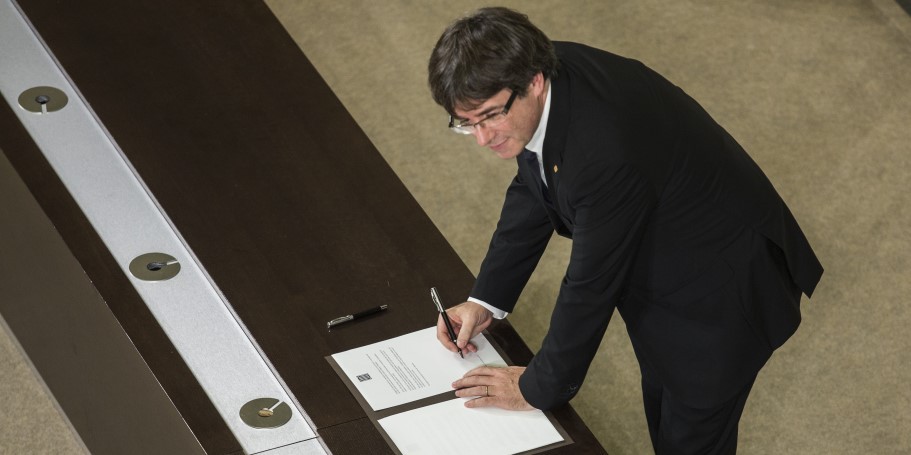 Глава Каталонии Карлес Пучдемон в парламенте автономного сообщества подписывает декларацию независимости