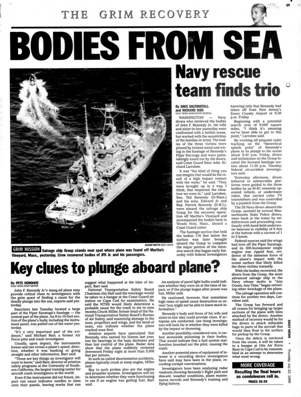 В 9: 20 вечера, 16 июля 1999 года, Джон Фицджеральд Кеннеди-младший из башни в аэропорту возле Martha’s Vineyard, штат Массачусетс, передал по радио, что готовится к посадке. Через несколько секунд, его самолет взорвался в воздухе, свидетелями взрыва стали несколько человек, в том числе местный журналист и адвокат.