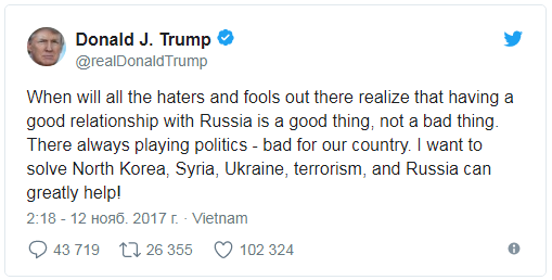 — Когда уже все хейтеры и дураки поймут, что иметь хорошие отношения с Россией — это хорошо, а не плохо? — написал американский лидер.