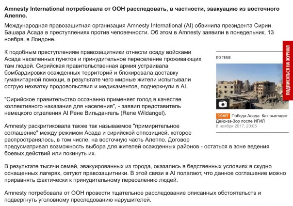 Или вот ещё оцените: «Amnesty раскритиковала также так называемое «примирительное соглашение» между режимом Асада и сирийской оппозицией, которое распространялось, в том числе, на восточную часть Алеппо. Договор предусматривал возможность выбора для жителей осаждённых районов - остаться в зоне ведения боевых действий или покинуть их.»
