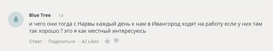 Не хочу быть адвокатом местной власти Ивангорода, но сравнивать этот маленький городок с третьим городом Эстонии — мягко говоря, некорректно. В обсуждении статьи NYT один из жителей Ивангорода задается риторическим вопросом (цитирую дословно, сохраняя стиль и пунктуацию): "И чего они тогда с Нарвы каждый день к нам в Ивангород ходят на работу если у них там так хорошо? это я как местный интересуюсь".
