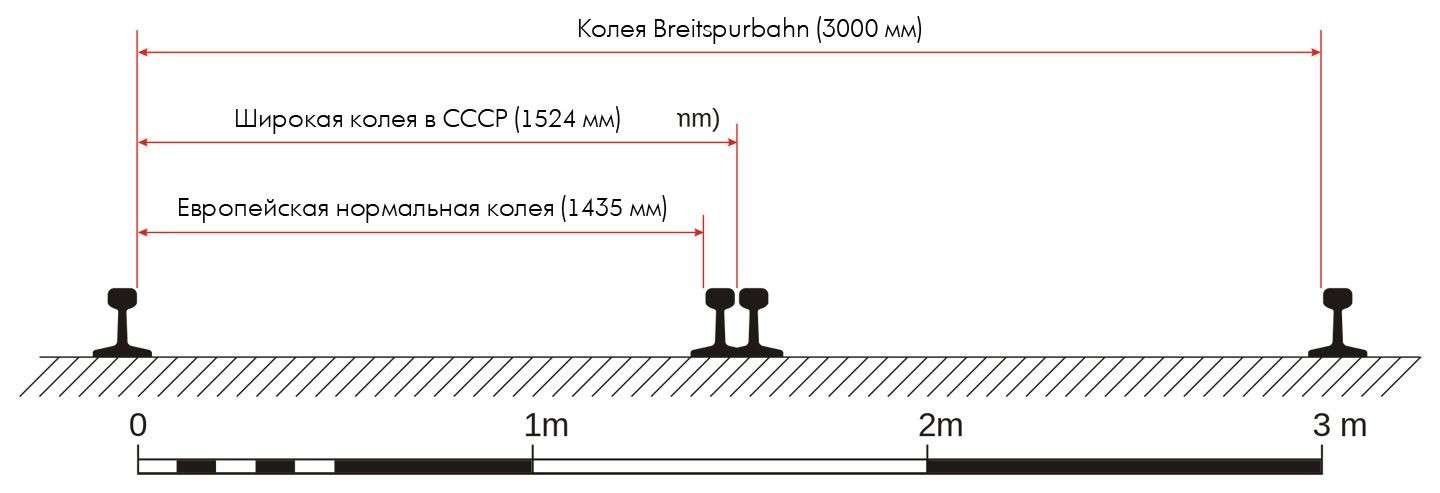 Сверхширокая колея позволяла резко увеличить грузоподъемность, плавность хода и скорость поезда. Были предложения пусть составы с огромной скоростью в 450 км/час, но они были отвергнуты как не имеющие практической ценности. И при скорости 250 км/ч в спальном вагоне не составляло проблем добраться до любой точки империи: от Берлина до Рима — 1627 км, до Бухареста — 1759 км, до Москвы — 1923 км, до Стамбула — 2429 км. Поэтому все расчеты производились для максимальных скоростей 250 км/ч для пассажирских поездов и 100 км/ч для товарных.