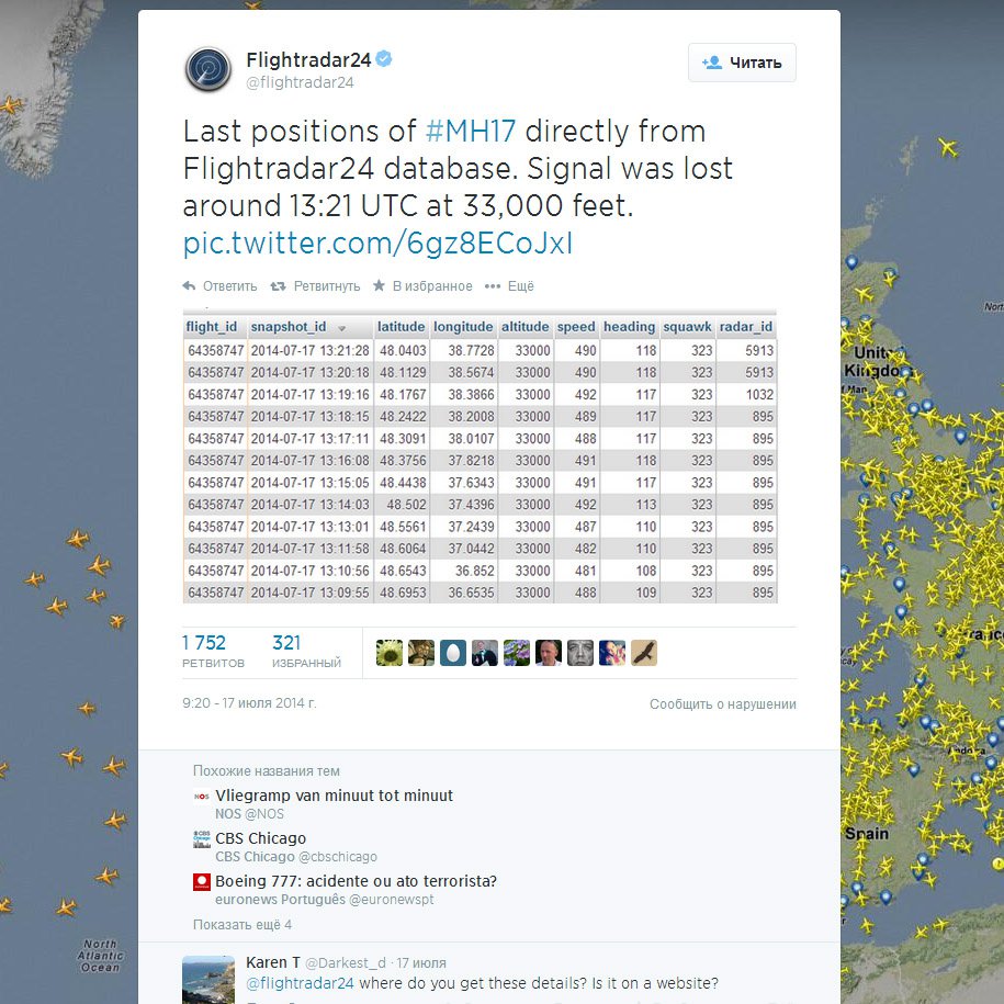 Теперь самое интересное: по скриншоту твиттера Flightradar24