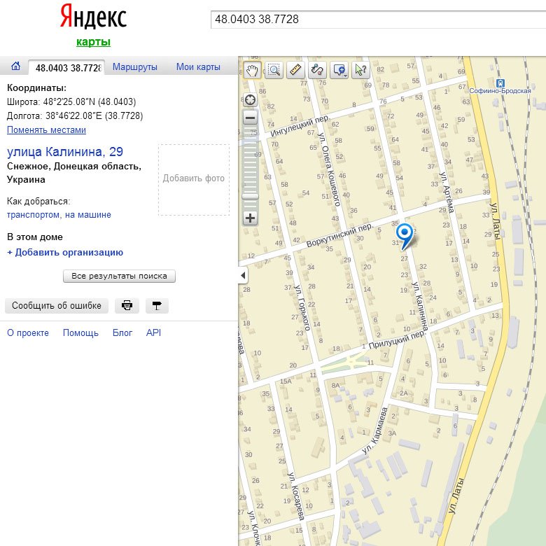 в верхней строке указаны номер рейса, дата и время, широта и долгота, высота, скорость и ещё три параметра. Если широту и долготу (48.0403 38.7728) вставить в поисковую строку Яндекс-Карты, то вы окажетесь на ул.Калинина,29 в гор.Снежное Донецкой области.