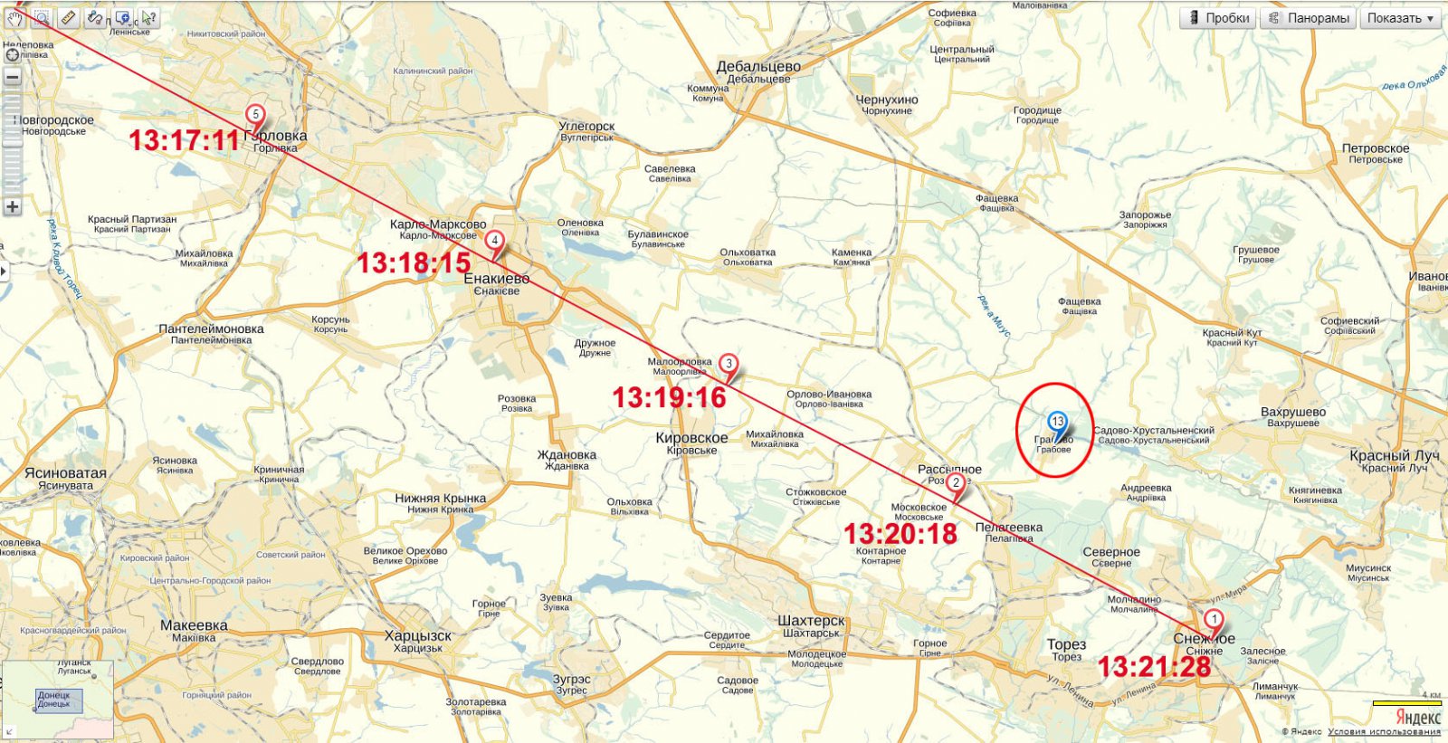 Значит Flightradar24 последней полученной от злополучного Боинга контрольной точкой определил Снежное. А упал самолёт в Грабово, т.е. в 15км от контрольной точки на северо-запад - в обратном направлении.