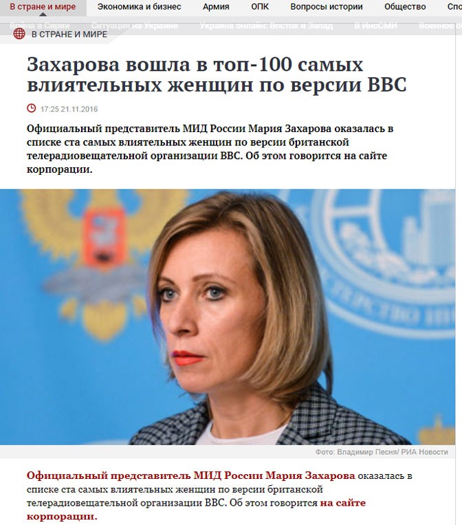 В 2016 году Мария Захарова оказалась в списке ста самых влиятельных женщин по версии британской телерадиовещательной организации BBC. Дипломата номинировали в категории «Политика».