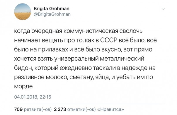 Не знаю, может быть все эти люди действительно имели тяжелое голодное детство и деревянные игрушки, прибитые к полу. Ибо такая ненависть к СССР может объясняться лишь глубокой психологической травмой, нанесённой в подростковый период, — невозможностью начать своё утро с ломтика пармезана, свежего круассана и чашечки дымящейся арабики, выпитой с видом на Гудзон, Темзу или Эйфелеву башню. Подозреваю, что для тех, кто всю сознательную жизнь считал, что жизнь есть только на западе — это действительно было тяжелым испытанием, наложившим отпечаток на всё их дальнейшее существование.