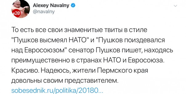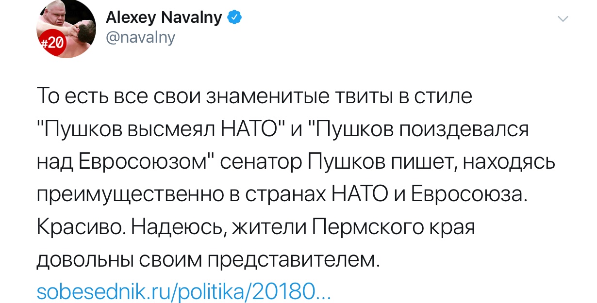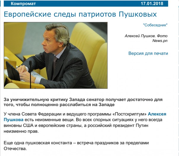 Суть её проста. Некий «журналист», основываясь на данных, полученных из фейсбука жены сенатора, опубликовал статью, в которой рассказывает о том, что ярый сторонник Путина и противник Запада Пушков предпочитает отдыхать за границей. А ещё Пушков плохо представляет в Совфеде интересы Пермского края. А ещё его уровень жизни не соответствует его зарплате. А ещё его дочка ездила в Финляндию в гости к Санта Клаусу. А ещё...