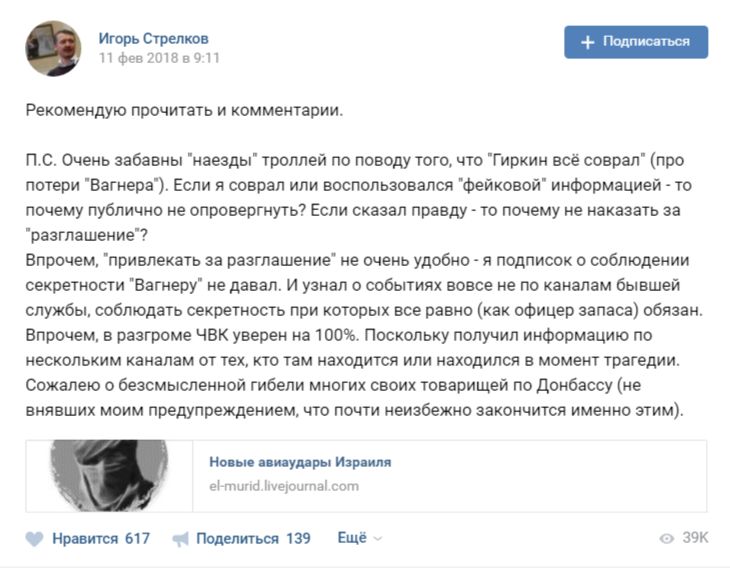 Стрелков пишет, что потери САА и российских добровольцев в Сирии исчисляются «сотнями». Более того, по его словам, - «под раздачу» попало и понесло потери какое-то подразделение нашего спецназа. И так далее, в своем фирменном - «обиженно-умном» стиле. Да вот, смотрите сами: