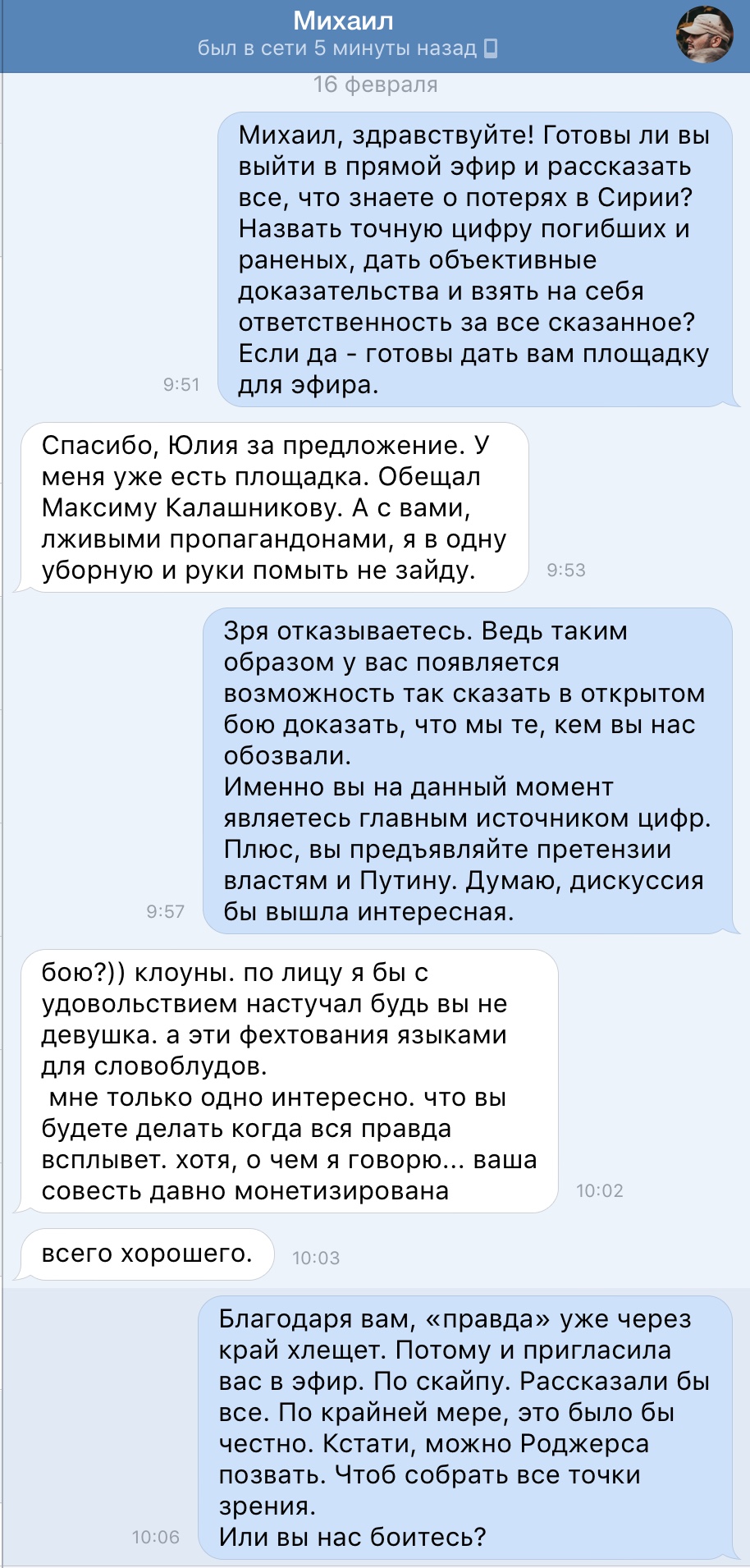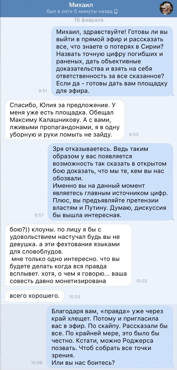 Разумеется, получила отказ. Вероятно по причине того, что одно дело писать в соцсетях всякое, и совершенно другое - озвучить это в прямом эфире в диалоге с оппонентами. Ведь каждое слово придётся обосновать конкретными фактами и нести за это ответственность. Г-н «осведомлённый осведомитель» это понимает. Очевидно потому и пошёл в отказ.
