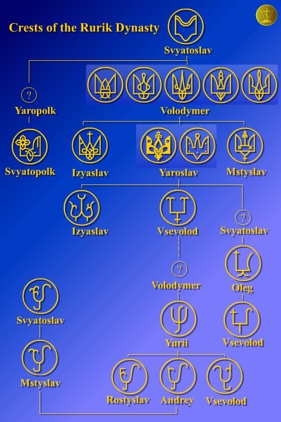 В качестве малого герба Украины принят один из вариантов трезубца Крестителя Руси равноапостольного Владимира. Его дети княжили уже в православной стране, а потому добавляли к своим трезубцам крест. А у внуков и правнуков были преимущественно двузубы (нередко тоже с крестами).