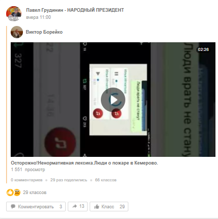 Вот, к примеру, на неофициальной странице паблика Павла Грудинина в "Одноклассниках" публикуется материал о 119 жертвах пожара — причём в качестве "доказательств" приводятся цифры максимальной заполненности одного из кинозалов ТРЦ "Зимняя вишня".