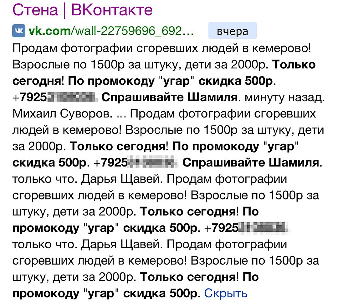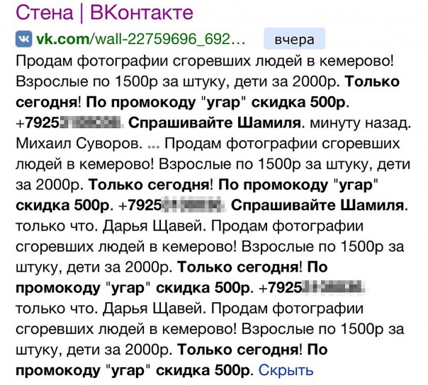 Сотни репостов, тысячи ретвитов. Даже некоторые уважаемые журналисты повелись на объявление, написанное от лица родственника жертв пожара в Кемерове: