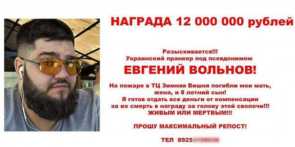«Награда 12 миллионов рублей. Разыскивается!!! Украинский пранкер под псевдонимом Евгений Вольнов». Вольнов, он же Никита Кувиков, в первые часы после пожара в Кемерове, распространял фейк о 300 погибших. Он обзванивал морги от имени майора МЧС, приказывая готовиться к приему сотен трупов. И связывался с ритуальными конторами, заказывая 300 гробов. Слухи по городу расползлись быстро.