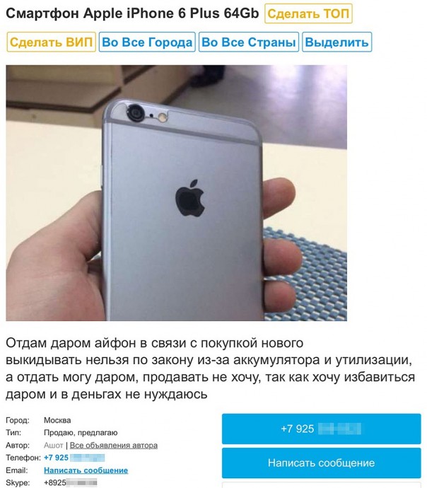 Встречается номер и в откровенно мошеннических объявлениях: «Отдам iPhone 6 Plus бесплатно.