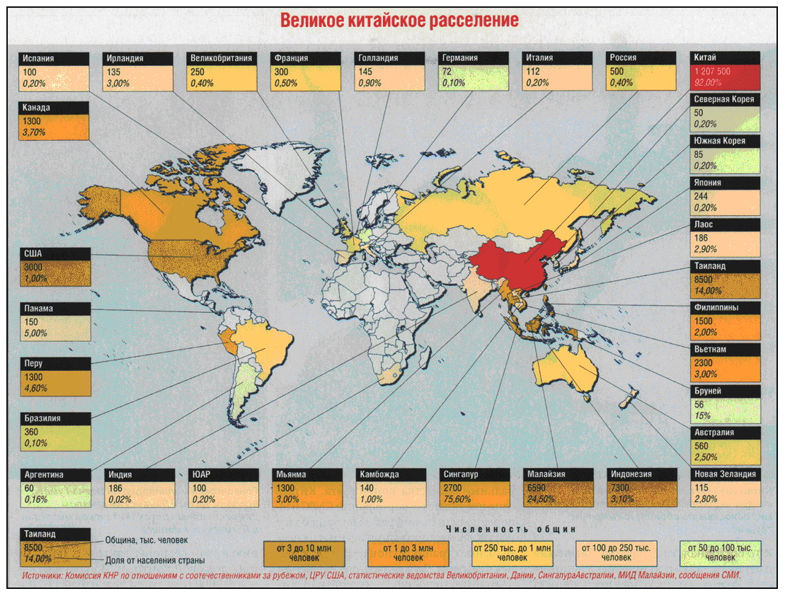 Специфика вопроса заключается в том, что отношение к ним со стороны коренных этносов исключает любые попытки какого-либо захвата этих стран пусть даже мирными средствами. Таким образом Пекин, наоборот, заинтересован в максимальном сотрудничестве именно с действующими властями. Другой вопрос, что доля этнических китайцев в правящих элитах в разы превышает их долю во всём населении. Так, в частности, в ЮВА 78% местного капитала и промышленных мощностей, а также 81% банковской сферы принадлежат выходцам из Китая, составляющим всего 6% населения своих стран. Так как большинство из них владеет ещё и долями в различных бизнесах на территории континентального Китая, это создаёт обширные неофициальные каналы по влиянию на политику сопредельных стран через как бы чисто экономические инструменты и преференции в участии в совместных проектах. В том числе и не военного назначения.