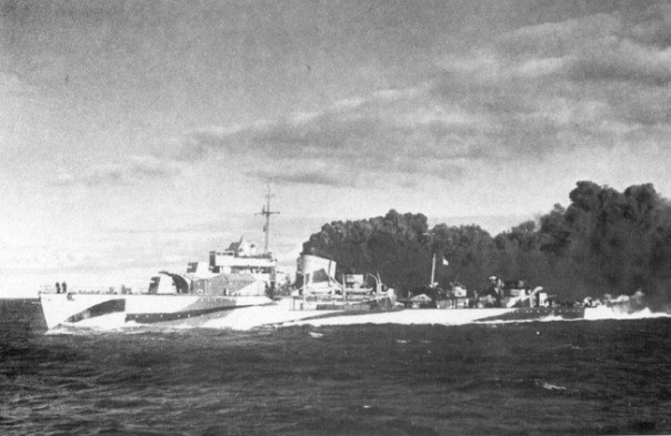 "Туман" рвался к берегу под прикрытие береговых артиллерийских батарей, однако немецкие эсминцы были быстрее. Они сблизились с кораблем на дистанцию в 50 кабельтовых (чуть больше девяти километров) и открыли огонь. Третий залп оказался результативным: "Туман" получил 11 прямых попаданий 127-миллиметровыми снарядами. Командир и комиссар корабля погибли. Кормовое орудие было повреждено, а носовое не могло вести огонь, так как вражеские эсминцы находились вне сектора его обстрела. Тем не менее сторожевик не сдавался. В ходе боя краснофлотцы Блинов и Семенов совершили подвиг — под огнем вновь подняли флаг корабля, сорванный с мачты взрывом. "Туман" отчаянно петлял, то снижал ход, то вновь набирал, словно приглашая противника подойти ближе. И наконец заманил его под огонь береговых батарей.