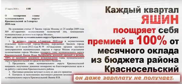 Финансовое самоудовлетворение главы округа Якубовича произошло 14 декабря 2017 года. А уже в марте 2018 точно так же «самопоощрил» себя другой «борец за права москвичей» и ставленник Навального на грядущих выборах мэра Москвы Илья Яшин. «Поощрить главу муниципального округа Красносельский Яшина Илью Валерьевича денежной премией в размере 100% от месячного денежного вознаграждения главы муниципального округа из средств местного бюджета», - написано в решении Совета депутатов № 4-08 от 23 марта 2018 года, скромно подписанного Яшиным. И поощрил себя юноша, разумеется, за выдающиеся успехи во всем хорошем на благо москвичей. Вы заметили эти успехи?