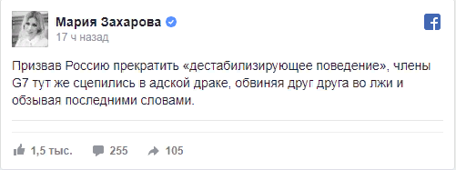 «Призвав Россию прекратить «дестабилизирующее поведение», члены G7 тут же сцепились в адской драке, обвиняя друг друга во лжи и обзывая последними словами», — написала она в Facebook.