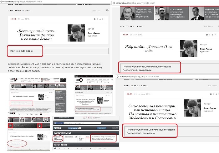 Я на протяжении нескольких лет вел блог на сайте «Эха». Ребят активно корежило от моих материалов и в большинстве случаев они отказывали в публикациях, присылая веселую формулировочку «В публикации отказано. Пост отклонен редактором». Однако, некоторые материалы моментально оказывались на сайте, если в них речь шла о каких-либо негативных моментах российской власти, чиновниках. Но ни дай Бог нехорошо упомянуть о жулике Навальном, отмороженном Шендеровиче, иностранных грантах для оппозиции или, наоборот, положительно рассказать о «Бессмертном полке» и махинациях с его информационным освещением в либеральных СМИ или о победе в Великой Отечественной. Сразу же, в течение пяти минут, «пост отклонен редактором».