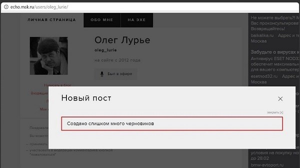 И, во-вторых, самая принципиальная и бесцензурная редакция «Эха» изобрела удивительное ноу-хау. Согласно правилам сайта, материалы, в публикации которых отказано, превращаются в, так называемые, «черновики» и висят на моей страничке, видимые только мне и редакции. Но если «черновиков» собралось более четырех, то перед очередной публикацией сайт вежливо сообщает «создано много черновиков» и просит их удалить. После удаления старых черновиков можно отправлять на модерацию (рассмотрение редактора) новые статьи. И вот тут-то я и узнал про цензурное ноу-хау «Эха Москвы». У меня, в моем блоге на этой удивительной радиостанции… перестали удаляться черновики и что-либо сделать с этим невозможно. Просто зависли и висят там вечно, тем самым, не давая возможности публиковать что-либо новое. Простенько и со вкусом. Вот как-то так: