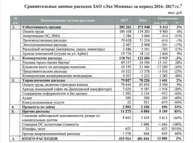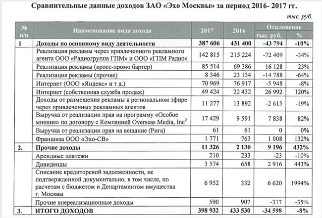 Итак, согласно заключению ревизионной комиссии ЗАО «Эхо Москвы» (документ имеется), радиостанция, как и многие СМИ, является активом убыточным. В 2016 году доходы «Эха Москвы» составили 433 миллиона 530 тысяч рублей, а расходы — 481 миллион 44 тысячи. На следующий год заработок «Эха» уменьшился на 34 миллиона 598 тысяч и составил 398 миллионов 932 тысячи. Зато расходы стали на 12 миллионов 880 тысяч больше и вылились в сумму 493 миллиона 924 рубля.