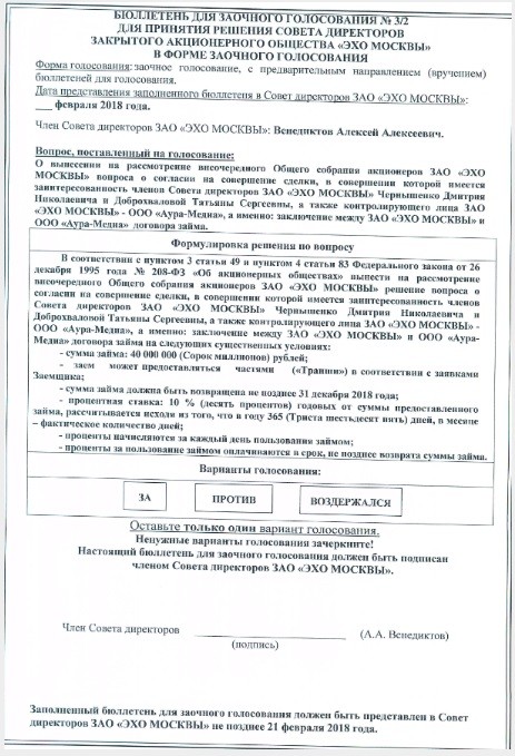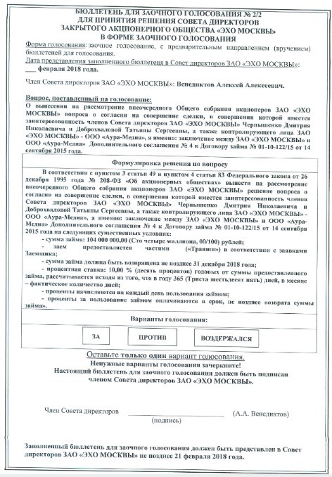 Финансовая помощь со стороны «Аура-Медиа» ожидается и в текущем году. По данным из бюллетеней для голосования совета директоров «Эха», в 2018-м на счета радиостанции должны поступить три транша на общую сумму 232 миллиона 500 тысяч.