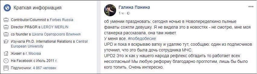 А вот вам случай другого характера. Сидит себе дома женщина, и что-то её тревожит. Может, после работы подустала. Знаете, как работать в пиар-службе такого гиганта, как «Леруа Мерлен»?!. Это вам не ящики на складах компании таскать. Руководителю пиар-службы и ум нужен, и смекалка, и умение привлечь к себе и к компании внимание. То ли от злости и усталости, то ли именно от желания привлечь к себе внимание, но пиарщица Галина Панина размещает в Facebook пост о том, что её стажёр рассказала ей, как пьяные футбольные фанаты сожгли в Новопеределкино девушку и бросили её умирать на улице. Затем Галина поставила хештег «победобесие» и сообщила, что начинает вскрывать и удалять «ватку». Ну, то бишь ватников. Сие заметила советник губернатора Московской области Марина Юденич и задалась в том же Facebook вполне справедливым вопросом: «А что делала в качестве докладчика Галина Панина на форуме «Территория смыслов», который проходит под патронажем Росмолодёжи?»