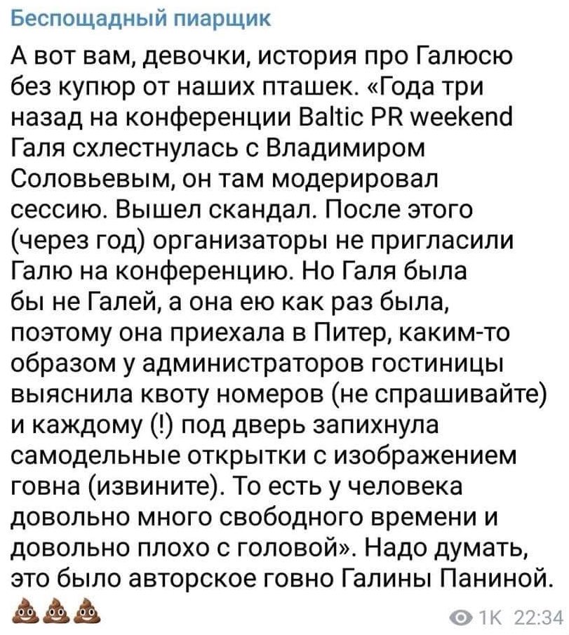Потому как Галина Панина продолжала виртуальную войну с элементами психических атак. Руководитель Школы ораторского влияния (да-да, и это тоже!) удаляла комментарии несогласных, успела дать угрожающее интервью одной из московских радиостанций, затем пояснить, что «ватка», это только те, кто её оскорбляет, а потом и вовсе пошла вразнос. Сначала она удалила свой аккаунт в Facebook, а затем восстановила. И знаете, о чём я подумал? Если руководство фирмы берёт руководителем пиар-службы даму с поведением, заставляющим крепко задуматься о её кондициях, то, может, вы и умственные способности других специалистов перестанете проверять? Так тогда к вам ходить станет просто опасно.