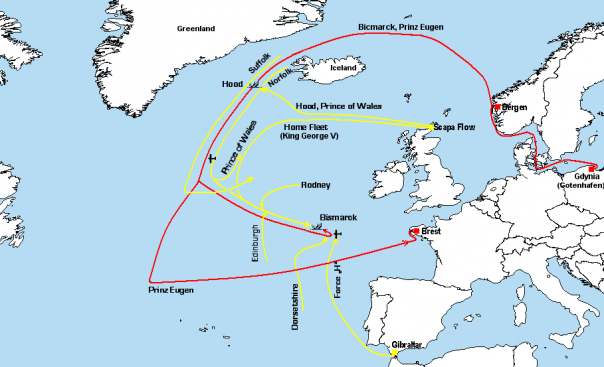 Схема рейда линкора "Бисмарк" и тяжёлого крейсера "Принц Ойген"